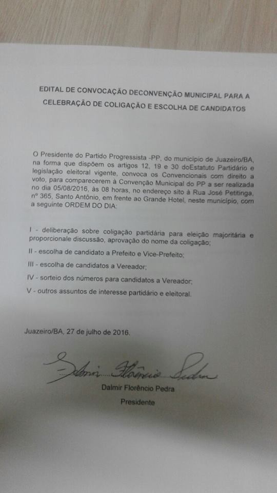 Juazeiro (BA): Convenção do PP será dia 05 de agosto