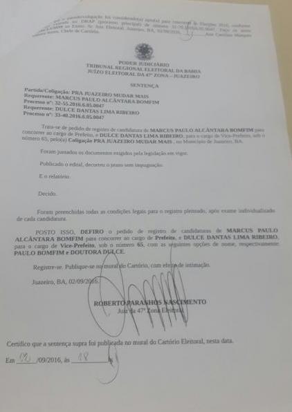 Juazeiro (BA): Paulo Bomfim e Dra. Dulce Ribeiro têm chapa deferida pela Justiça Eleitoral