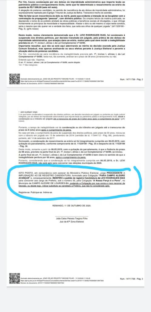 O juiz da 67ª Zona Eleitoral, sediada em Remanso, Dr. João Celso Targino Filho expediu neste domingo (11/10), decisão pela impugnação da candidatura de Levi Dias Rodrigues (PSD), sentença que resulta na negativa do seu registro como candidato a prefeito, na eleição deste ano em Campo Alegre de Lourdes, norte da Bahia.
