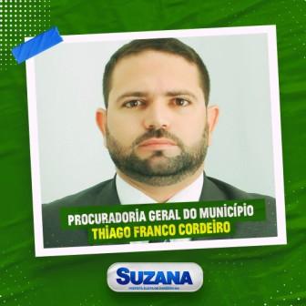 Thiago Franco Cordeiro foi o escolhido para comandar a Procuradoria Geral da Prefeitura Municipal de Juazeiro. Desde a segunda-feira (28/12) a prefeita eleita, Suzana Ramos (PSDB) tem divulgado em suas redes sociais os nomes que vão compor o time de secretários do novo governo.