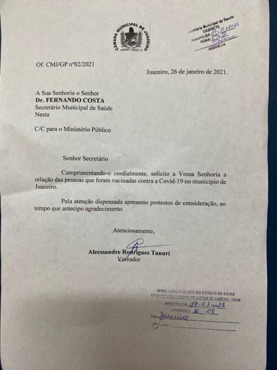 O Vereador Alex Tanuri solicitou oficialmente nesta quarta-feira (20/01) que o Secretário de Saúde de Juazeiro (BA), Fernando Costa, informe a lista nominal das pessoas vacinadas contra o novo coronavírus (covid-19), no município.