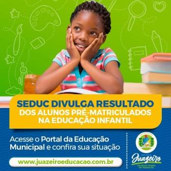 A Secretaria de Educação e Juventude (Seduc) de Juazeiro informa que já está disponível para consulta, a classificação dos alunos pré-matriculados na Educação Infantil (crianças de 6 meses a 3 anos). O resultado está disponível no Portal da Educação Municipal, através do link www.juazeiroeducacao.com.br