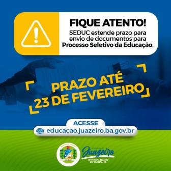 A Prefeitura de Juazeiro estendeu o prazo para o envio de documentos, para o Processo Seletivo Simplificado para a Rede Municipal de Ensino. A Secretaria de Educação e Juventude (Seduc) informa que o procedimento poderá ser realizado pelos candidatos até o dia 23 de fevereiro, através do site de Processos Seletivos.