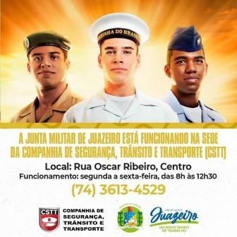 A Junta Militar de Juazeiro está funcionando em novo endereço. A partir de agora, passará a atender na sede da Companhia de Segurança, Trânsito e Transporte (CSTT), na Rua Oscar Ribeiro, no centro, em uma parceria com a Prefeitura Municipal. O órgão atua na emissão do certificado de Alistamento Militar e da carteira de reservista.