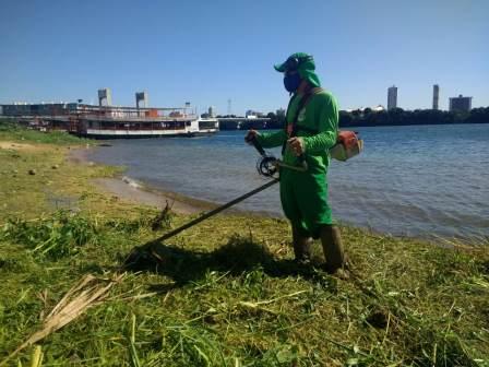 As equipes estão realizando serviços de limpeza, capina e roçagem em toda a sua extensão das margens do Rio São Francisco.