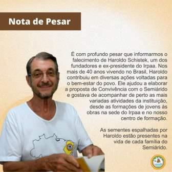 O deputado estadual Zó, com profundo pesar, lamenta o falecimento de Haroldo Schistek, um dos fundadores do Instituto Regional da Pequena Agricultura Apropiada(IRPAA). ocorrido na tarde desta quinta-feira (09/12), em Juazeiro (BA).