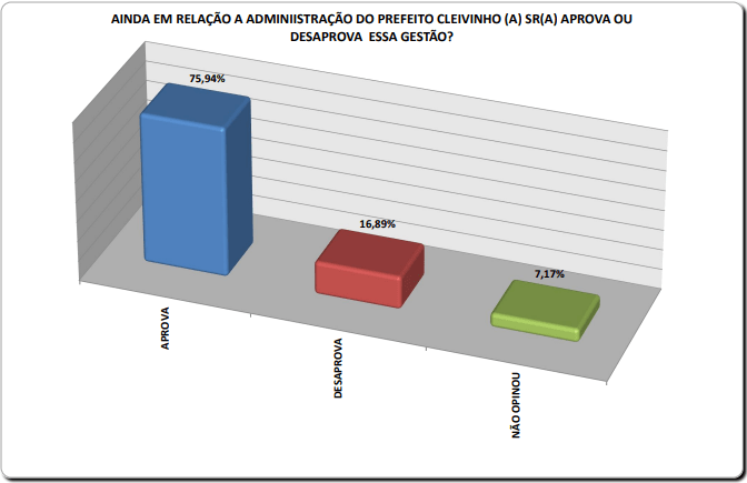 A atual administração foi avaliada como ótima por 21,33% das pessoas, 43,69% avaliaram como boa, e 15,36% como regular, o que representa 80,38% de aceitação.