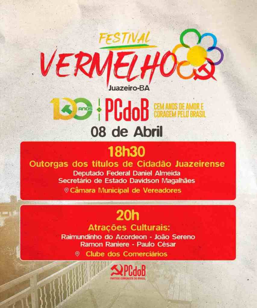 A solenidade de outorga dos títulos está marcada para às 18h30 na Câmara Municipal de Juazeiro e logo após, às 20h, no Clube dos Comerciários, haverá um evento cultural, intitulado “Festival Vermelho”, com homenagens a Daniel Almeida e Davidson Magalhães, dando sequência a uma série de eventos em comemoração aos 100 anos do PCdoB. Dentre as atrações estão Raimundinho do Acordeon, João Sereno, Ramon Raniere e Paulo César, dentre outros.