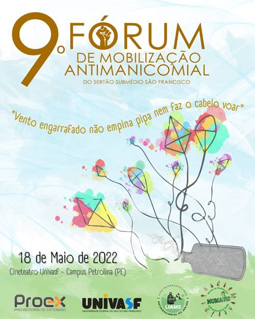 A Universidade Federal do Vale do São Francisco (Univasf) promoverá no próximo dia 18 de maio o 9º Fórum de Mobilização Antimanicomial (FMA), na sua ‘edição de bolso’ no espaço Cineteatro da sede da instituição, em Petrolina (de frente ao prédio da reitoria), das 14h às 18h. O tema definido do encontro – “Vento engarrafado não empina pipa nem faz o cabelo voar” – é o gancho para que os debates, trocas e encontros trazidos foquem no compartilhamento de experiências de cuidado em Saúde Mental que apoiam o fortalecimento do projeto de um sertão sem manicômios, à luz das conquistas do processo de Reforma Psiquiátrica iniciado no país no final da década de 1970.