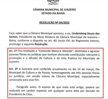 Foi aprovada na Câmara de Vereadores de Juazeiro o Projeto de Resolução que instituiu a “Comenda Manuca Almeida”, uma homenagem à memória do poeta Manuca, que tem como objetivo “agraciar pessoas físicas ou jurídicas que tenham oferecido contribuição relevante à promoção e a difusão da cultura e da arte poética no município de Juazeiro”, versa.