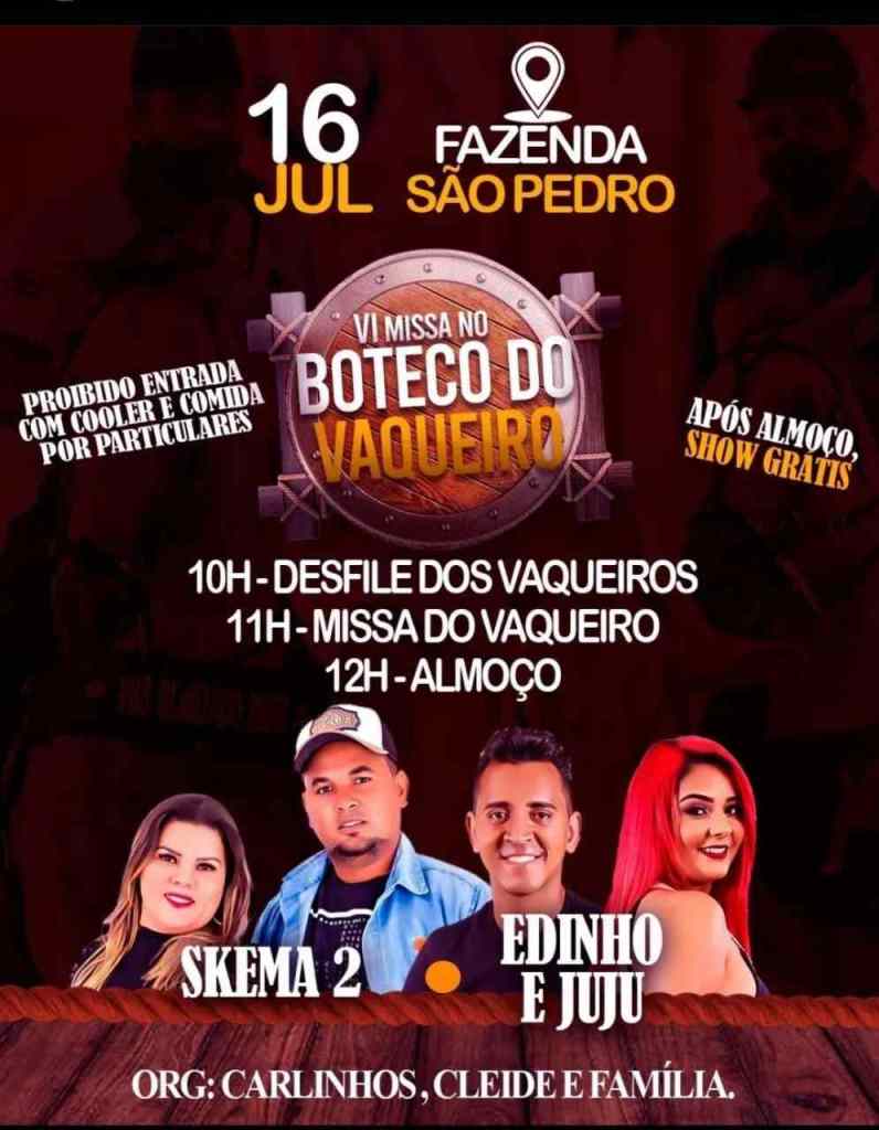 A programação terá às 10 horas da manhã Desfile dos Vaqueiros, às 11 horas a tradicional Missa dos Vaqueiros, meio-dia almoço e em seguida shows grátis com Skema 2 e Edinho e Juju, com a organização de Carlinhos, Cleide e família.