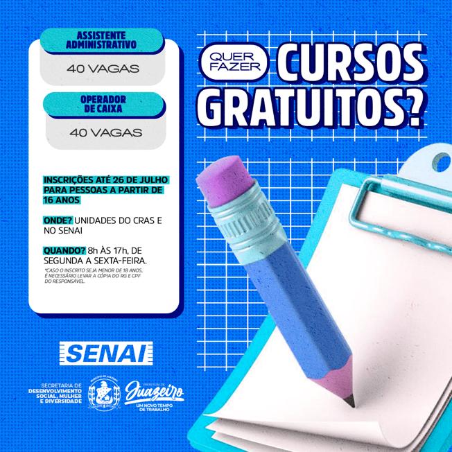 Com o objetivo de melhorar as condições para quem busca qualificação no mercado de trabalho, a Prefeitura de Juazeiro, através da Secretaria de Desenvolvimento Social, Mulher e Diversidade (Sedes)/Superintendência de Políticas Sociais e Diretoria da Mulher, em parceria com o Serviço Nacional de Aprendizagem Industrial (Senai), está oferecendo os cursos de formação para assistente administrativo e operador de caixa. Estão sendo ofertadas 40 vagas para cada curso oferecido, de forma totalmente gratuita.