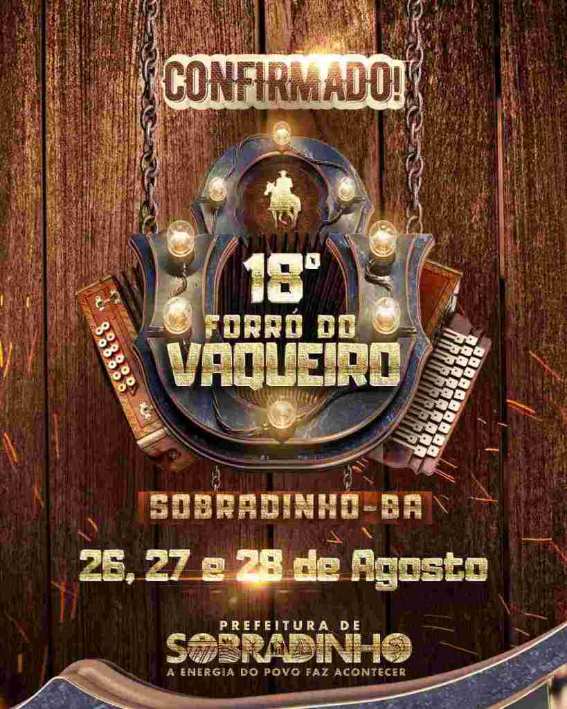 A 18º Edição do Forró do Vaqueiro de Sobradinho-BA acontecerá nos dias 26, 27 e 28 de agosto com uma programação cultural, religiosa e de grandes shows no Pátio de Eventos Vaqueiro Brian. O tradicional Forró do Vaqueiro reúne centenas de vaqueiros de toda região e já marca o calendário de festas no Vale do São Francisco. Além de preservar a tradição cultural, o evento promove o lazer e o turismo, aquecendo a economia local, gerando renda para o município. Na programação do Forró do Vaqueiro constam shows musicais no Pátio de Eventos Vaqueiro Brian, café da manhã, desfile, missa e o Forró da Espora.