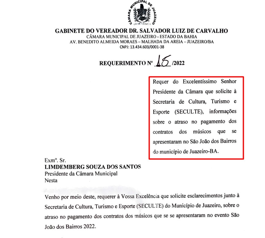 Requerimento encaminhado à mesa diretora da Câmara de vereadores de Juazeiro, no último dia 21 de setembro, cobrou uma ação do legislativo no sentido de buscar informações junto à secretaria de Cultura, Turismo e Esporte (SECULTE), acerca do atraso nos pagamentos dos cachês dos músicos que se apresentaram no São João dos Bairros do município.