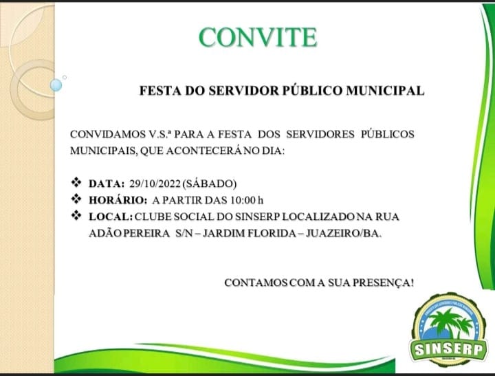 O Sindicato dos Servidores Públicos Municipais de Juazeiro – BA (SINSERP) vai promover neste sábado (29/10), a Festa do Servidor Público Municipal, a partir das 10 horas da manhã, em seu Clube Social, localizado na Rua Adão Pereira, S/N – Bairro Jardim Flórida.