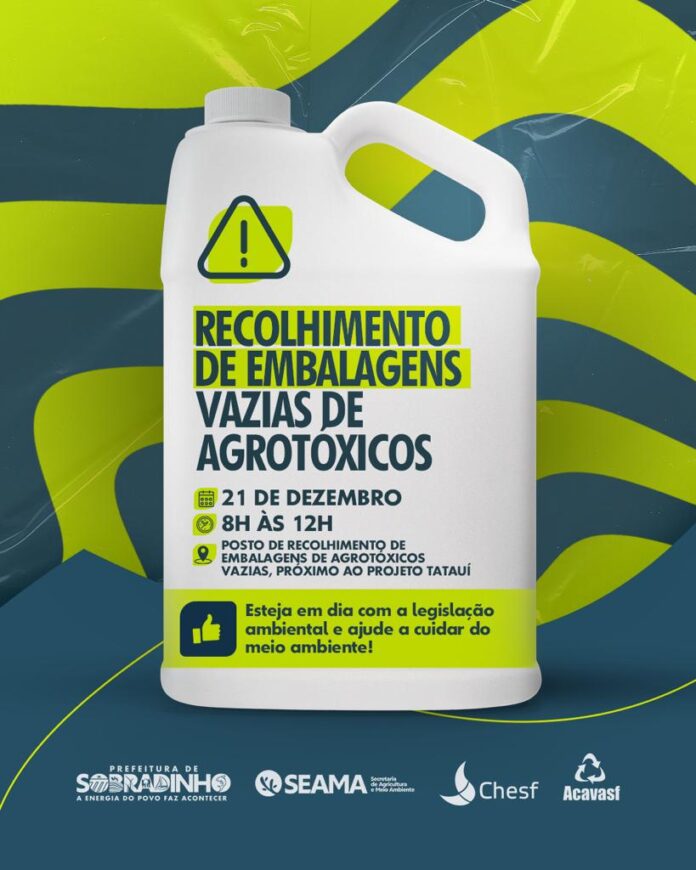 Acontece nesta segunda-feira (21/12), das 8 às 12 horas, o dia D da campanha de coleta de embalagens de agrotóxicos, promovida pela Prefeitura de Sobradinho, através da Secretaria de Agricultura e Meio Ambiente – SEAMA, em parceria com a Fokus. O material deve ser entregue no posto montado próximo ao projeto Tatauí.