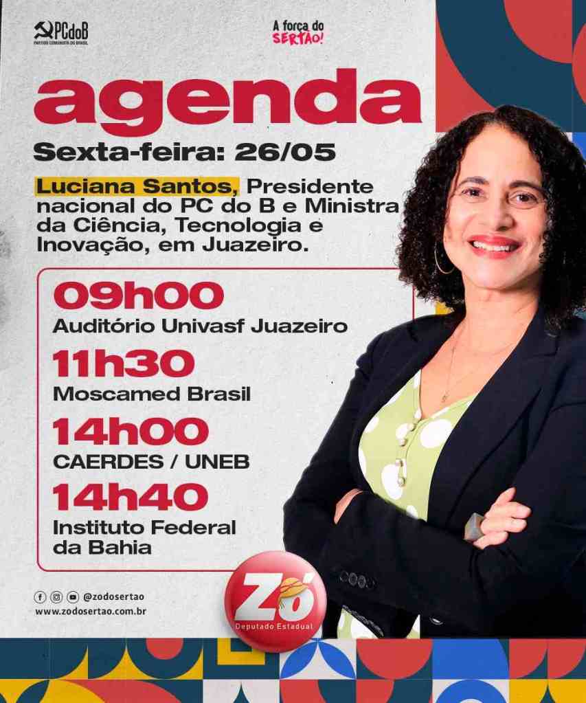 Após articulação do deputado estadual Zó, a Ministra da Ciência, Tecnologia e Inovação, Luciana Santos, estará em Juazeiro, nesta sexta-feira (26/05), quando fará no auditório da Universidade Federal do Vale do São Francisco (Univasf), às 9h, uma explanação ao público sobre os desafios da ciência e tecnologia no governo Lula, além de visitas técnicas. A visita contará com as presenças do deputado federal Daniel Almeida, do secretário estadual de Ciência, Tecnologia e Inovação, André Joazeiro, e do secretário do Trabalho, Emprego, Renda e Esporte da Bahia, Davidson Magalhães.