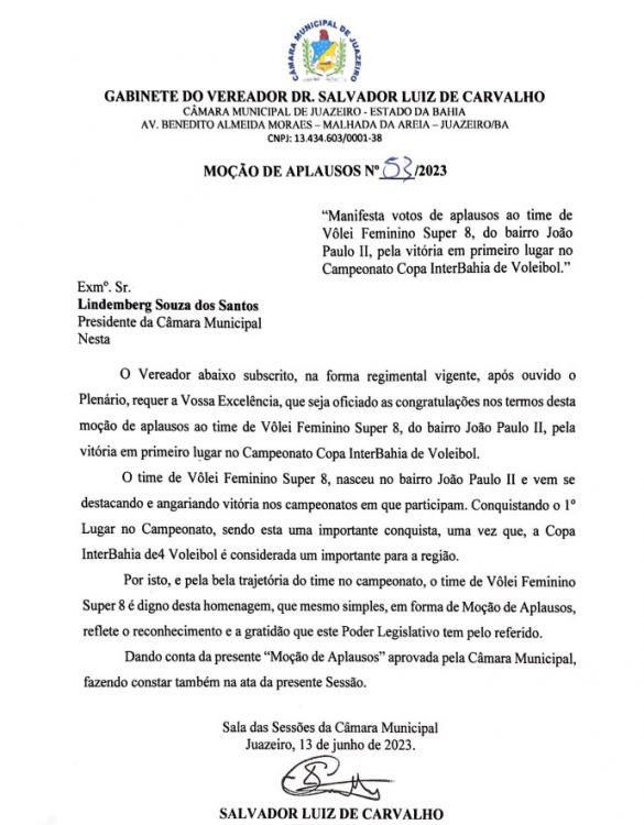No documento Dr. Salvador lembrou que a equipe de Vôlei Feminino Super 8, do bairro João Paulo II, “vem se destacando e angariando vitória nos campeonatos em que participa, culminando com o 1º Lugar na Copa InterBahia de Voleibol, uma das mais importantes da região, na modalidade”.