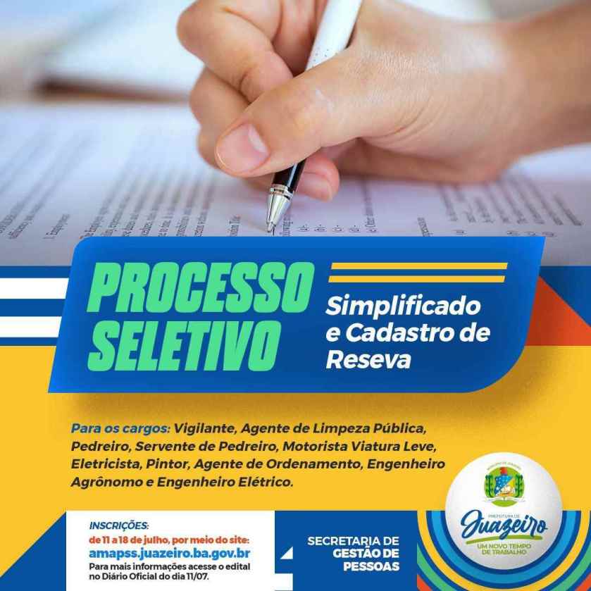 A prefeitura de Juazeiro, por meio da Secretaria de Gestão de Pessoas (SEGESP), divulgou na Edição do Diário Oficial do Município (Doem), desta segunda-feira (10/07), o Edital 05/2023 para as inscrições do processo seletivo simplificado e cadastro reserva.