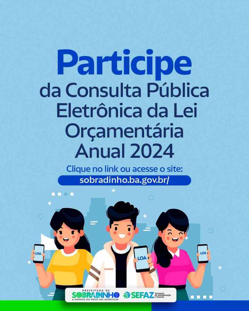 A Prefeitura de Sobradinho, através da Secretaria da Fazenda e Administração, convida os cidadãos a participarem da Coleta de Sugestões Eletrônica para a elaboração do Projeto de Lei Orçamentária Anual – LOA 2024, que começa no dia 20 de julho e segue até o dia 20 de agosto.