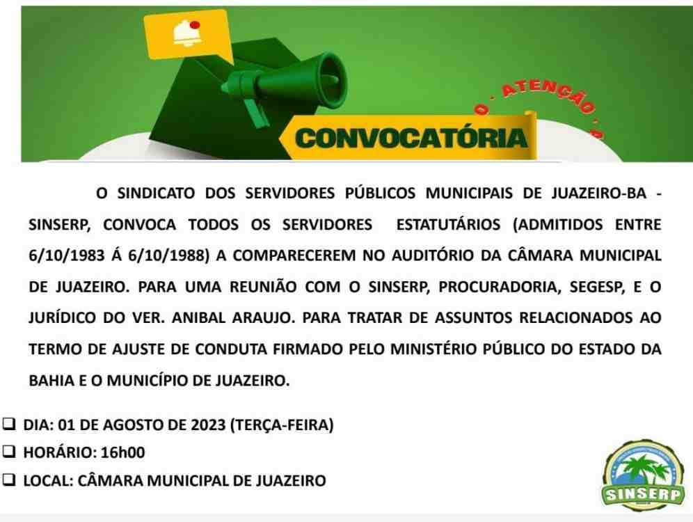 “O Sindicato dos servidores públicos municipais de Juazeiro/BA – SINSERP, convoca todos os servidores estatutários (admitidos entre 06/10/1983 a 06/10/1988) a comparecerem no auditório da câmara municipal de Juazeiro, para uma reunião com o SINSERP, procuradoria, SEGESP, e o jurídico do vereador Aníbal Araújo, para tratar de assuntos relacionados ao termo de ajuste de conduta firmado pelo Ministério Público do Estado da Bahia e o município de Juazeiro.”
