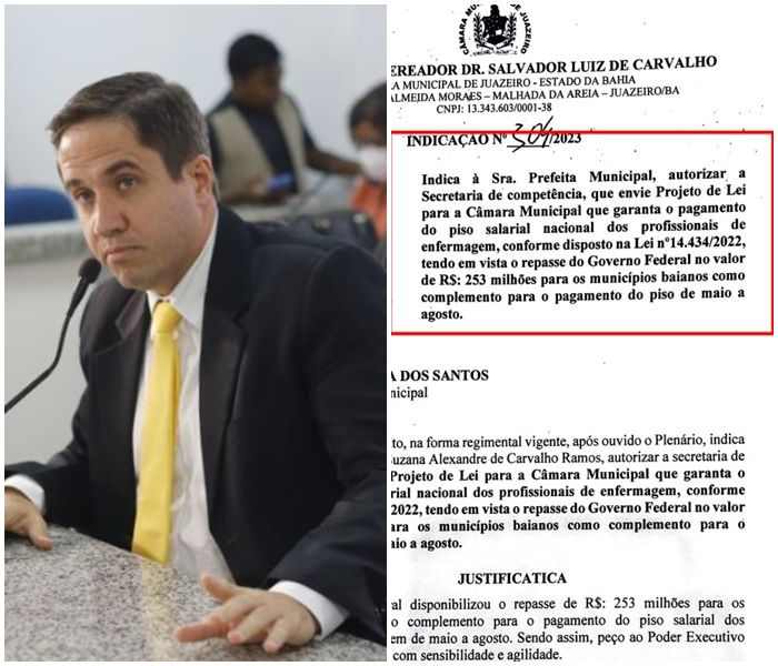No documento encaminhado à mesa do legislativo, o vereador “solicita que após ouvido o Plenário, indica à Prefeita Municipal Suzana Alexandre de Carvalho Ramos, autorizar a secretaria de competência, que envie Projeto de Lei para a Câmara Municipal que garanta o pagamento do piso salarial nacional dos profissionais de enfermagem, conforme disposto na Lei 0º14.434/2022, tendo em vista o repasse do Governo Federal no valor de R$: 253 milhões para os municípios baianos como complemento para ó pagamento do piso de maio a agosto”, escreveu.