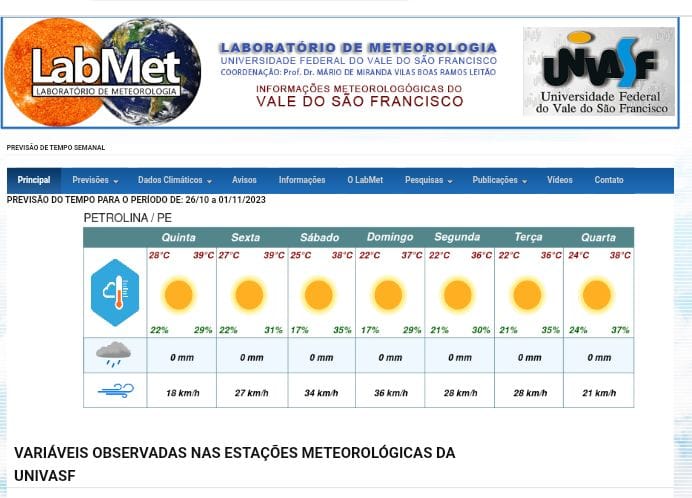 Petrolina (PE), Juazeiro (BA) e o Vale do São Francisco têm enfrentado nos últimos dias, uma massa de ar seco e uma temperatura muito quente. Nessa quinta-feira (26/10), a temperatura chegou a atingir 39ºC, sendo a maior registrada este ano, conforme dados do Laboratorio de Meteorologia (LabMet) da Universidade Federal do Vale do São Francisco (Univasf).