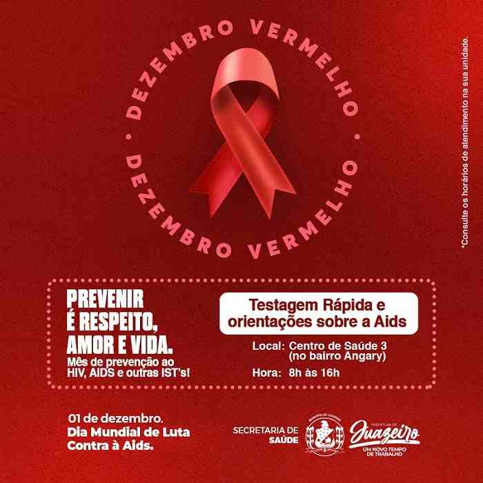 Dezembro é o mês dedicado à conscientização sobre HIV/Aids, que faz um alerta para a população sobre os cuidados para prevenção e tratamento da doença. A Prefeitura de Juazeiro, por meio da Secretaria de Saúde (Sesau), organizou uma programação com diversas atividades durante o mês. Serão realizados atendimentos em saúde e ações educativas.