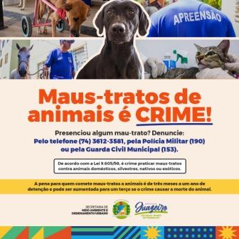 A Prefeitura de Juazeiro, por meio da Secretaria de Meio Ambiente e Ordenamento Urbano (Semaurb), alerta a população sobre que é crime maltratar animais, de acordo com a Lei 9.605/98, artigo 32. Atualmente, a legislação prevê pena de três meses a um ano de detenção para quem pratica os atos contra animais. A pena é aumentada de um sexto a um terço, se o crime causa a morte do animal.