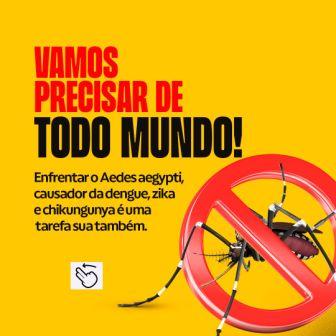 “Vamos precisar de todo mundo- Enfrentar o Aedes aegypti é uma tarefa sua também”, alertando a população para os cuidados que devem ser adotados para evitar a proliferação de criadouros do mosquito Aedes aegypti, transmissor da dengue. Dados do MS apontam que 75% dos focos estão localizados nas residências, o que chama atenção para a responsabilidade dos moradores no trabalho de prevenção e combate ao mosquito.
