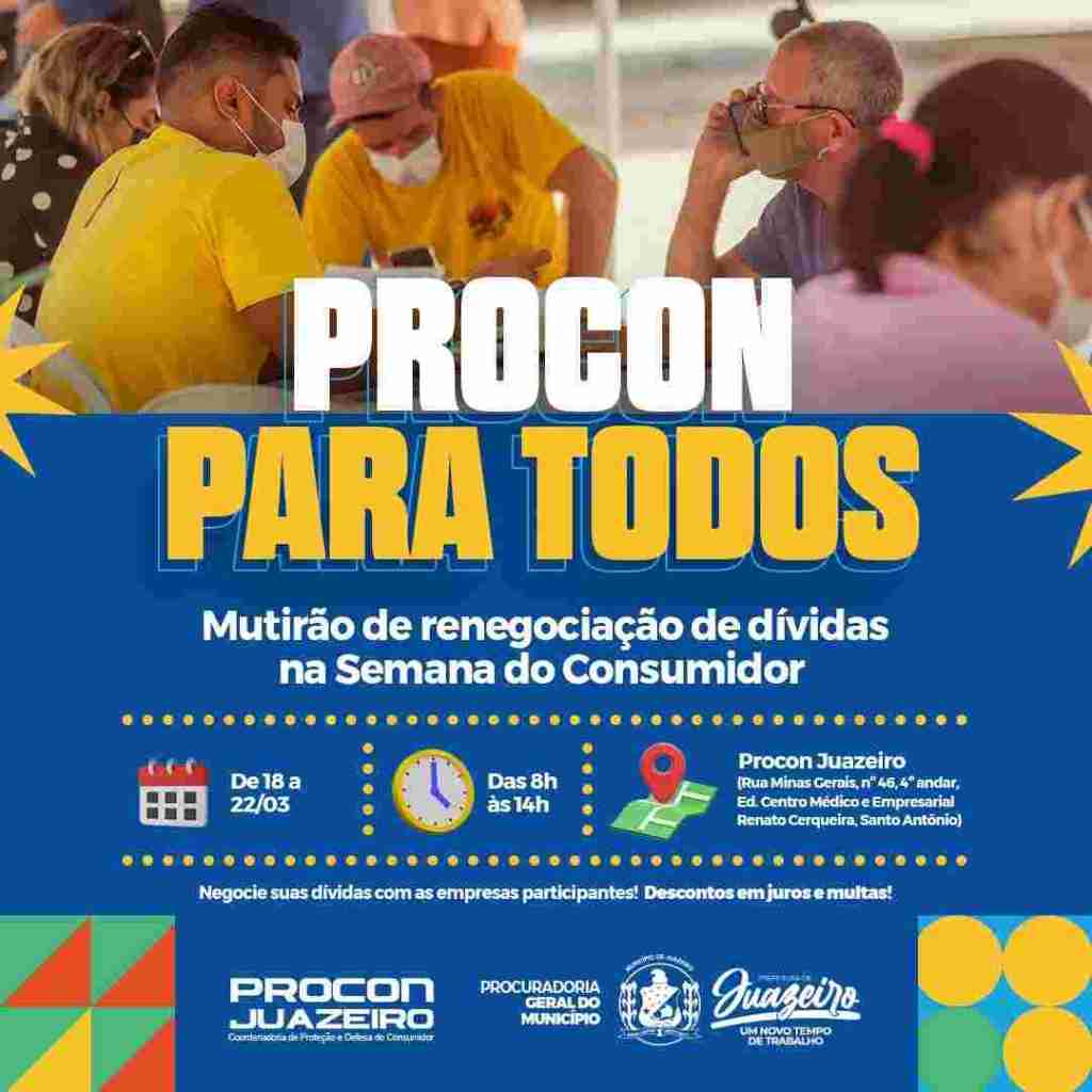 Em comemoração ao Mês do Consumidor, o Procon de Juazeiro, órgão vinculado à Procuradoria Geral do Município (PGM), vai promover um grande mutirão de renegociação de dívidas, entre os dias 18 e 22 de março. A iniciativa será dedicada a auxiliar os consumidores a pôr em dia seus débitos, livrando-se de pendências financeiras com as empresas Claro, Companhia de Eletricidade do Estado da Bahia (Neonergia Coelba), Serviço de Água e Saneamento Ambiental (SAAE), Bradesco e Caixa Econômica Federal.