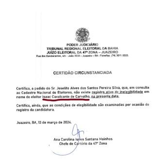 Quando consultado sobre a situação eleitoral do ex-prefeito de Juazeiro, Isaac Carvalho, o Tribunal Regional Eleitoral da Bahia (TRE-BA) responde da seguinte forma: “Não existe registro ativo de inelegibilidade em nome do eleitor Isaac Cavalcante de Carvalho na presente data”.