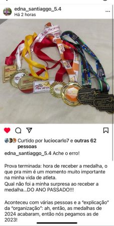 Em eventos de corrida de rua, é costume que todos os atletas sejam agraciados com medalhas de participação. O ocorrido deixou muitos atletas frustrados e indignados.