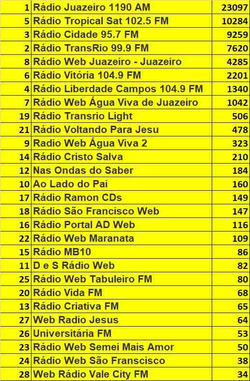 No período de 01º a 30 abril, a Rádio Juazeiro, sediada no norte da Bahia, alcançou 23.097 acessos, bem à frente da segunda colocada que obteve apenas 10.284. Esses números levam em consideração somente os acessos do site: radios.com.br e do aplicativo RádiosNet, contudo especialistas afirmam que através das ondas sonoras em aparelhos de rádio e por outros meios e demais sites e APPs, essa tendência se aplica e a RJ alcança em média 65% da liderança em audiência na região.