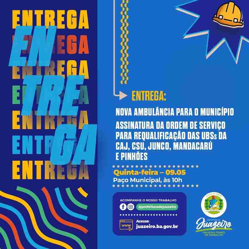 A Prefeitura de Juazeiro, por meio da Secretaria de Saúde (Sesau), segue investindo e conquistando importantes resultados para assistência em saúde pública de Juazeiro. Nesta quinta-feira (09/05), a prefeita Suzana Ramos irá assinar ordens de serviço para a requalificação de cinco Unidades Básicas de Saúde (UBSs). Além disso, também recebe uma ambulância de suporte básico oriunda de indicação do deputado estadual Jordávio Ramos.