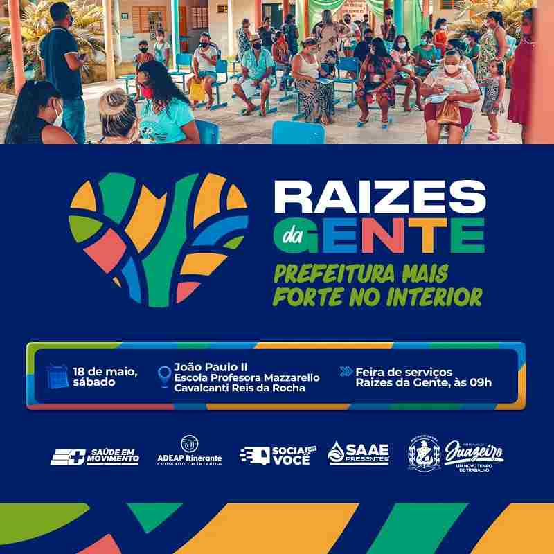 A Prefeitura de Juazeiro, sob a liderança da prefeita Suzana Ramos, realizará neste sábado (18/05), o evento “Raízes da Gente” no bairro João Paulo II. A ação é em comemoração aos 45 anos do bairro e visa promover o desenvolvimento local e oferecer uma variedade de serviços públicos nas áreas de saúde, educação, desenvolvimento social e meio ambiente. O evento começará às 9h na Escola Municipal Professora Mazzarello Cavalcanti Reis da Rocha, ao lado da Praça Central do João Paulo II.