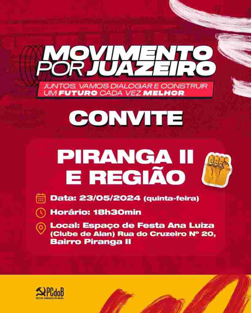 Após a apresentação a lideranças políticas, sindicais, comunitárias, representantes de instituições e população em geral, o #MovimentoporJuazeiro vai ao bairro Piranga II e região, nesta quinta-feira (23/05), apresentar à população a pré-candidatura a prefeito de Zó e também ouvir as demandas da sociedade, que tem passado por um caos administrativo jamais visto na história política do município.