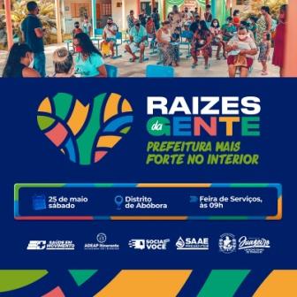 O distrito de Abóbora receberá neste sábado (25/03), o evento “Raízes da Gente”, organizado pela Prefeitura de Juazeiro. A ação tem o objetivo de impulsionar o desenvolvimento local e oferecer diversos serviços públicos nas áreas de saúde, educação, desenvolvimento social e meio ambiente. O evento começará às 9h, na Escola Municipal Manoel de Souza Bonfim, ao lado da Praça Central de Abóbora.