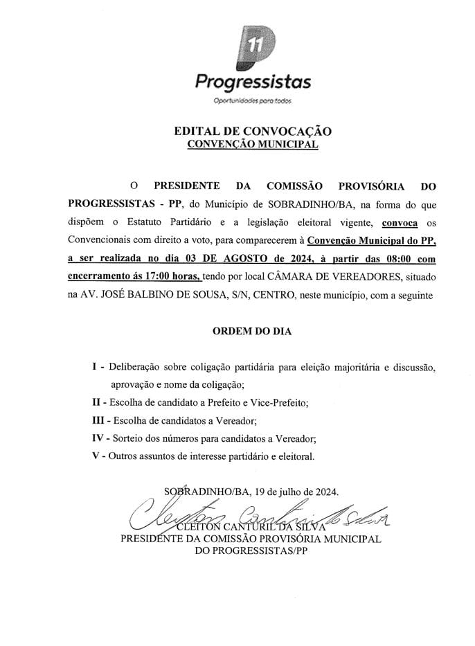 O Partido Progressistas (PP), em Sobradinho (BA), está convocando os seus filiados convencionais, para a Convenção Municipal, que será realizada sábado (03/08), das 08h00 da manhã às 17h00, na Câmara de Vereadores.