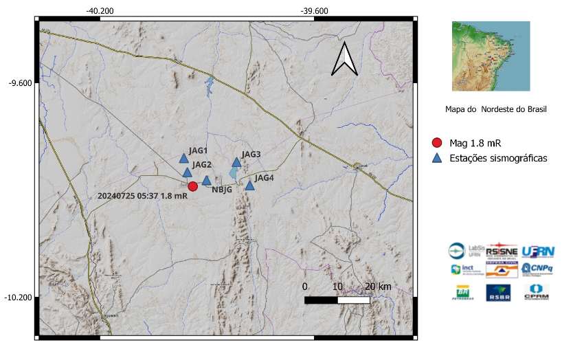 Tremores de terra estão assustando os moradores do distrito de Pilar – Jaguarari (BA). Após o abalo de magnitude 3.6 mR registrado ontem na região do distrito de Pilar, no município de Jaguarari/BA, já foram detectados outros dois sismos de menor intensidade. Nesta quinta-feira, dia 25 de julho, um tremor de terra foi registrado pelo LabSis/UFRN na região. O sismo ocorreu às 05h37 UTC (02h37, horário de Brasília), com magnitude preliminar calculada em 1.8 mR.