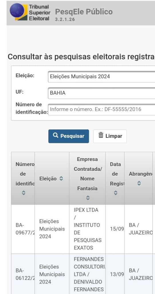 Consulta ao site do Tribunal Superior Eleitoral (TSE) mostra que duas pesquisas foram registradas, estão em andamento e devem ser divulgadas ainda nesta semana, sobre a disputa para prefeito (a) em Juazeiro (BA).