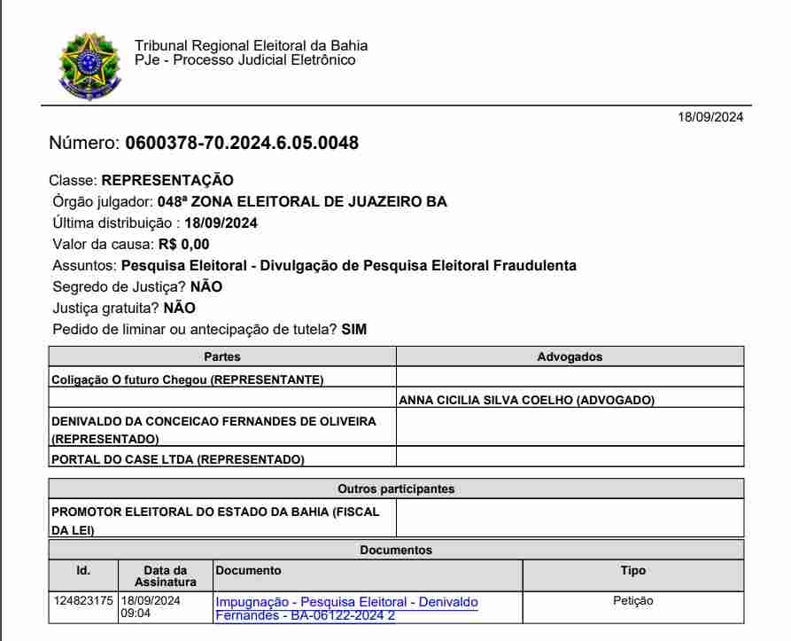 Diante deste histórico relatado, uma pesquisa divulgada por tal instituto tem o claro objetivo de induzir o eleitorado a campanha visualmente derrotada. A impugnação (0600378-70.2024.6.05.0048) será apreciada pelo juízo da 48ª Zona Eleitoral de Juazeiro, a quem foi solicitado que impeça o Sr. Denivaldo Fernandes de tentar manipular o eleitor de Juazeiro pela segunda vez.