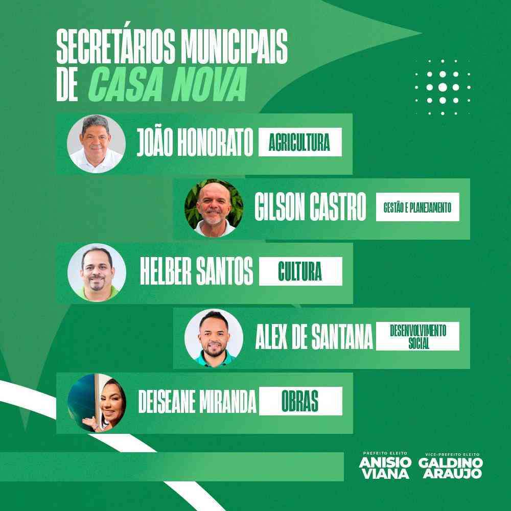O prefeito eleito de Casa Nova (BA), Anisio Viana anunciou nesta terça-feira (26/11) a composição de seu secretariado municipal, através de suas redes sociais.