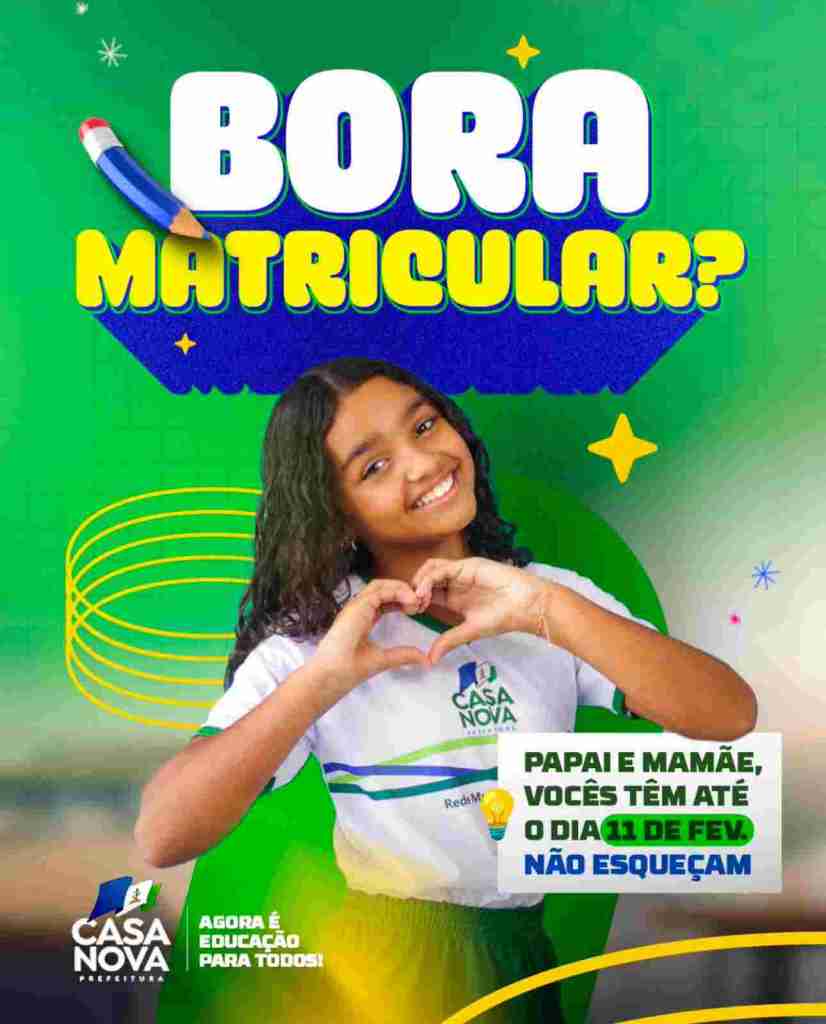 A Prefeitura de Casa Nova, por meio da Secretaria Municipal de Educação, está com as matrículas abertas para o ano letivo de 2025 na Rede Municipal de Ensino. As matrículas seguem até o dia 11 de fevereiro, com oferta de vagas para a Educação Infantil, Ensino Fundamental e Educação de Jovens e Adultos (EJA).
