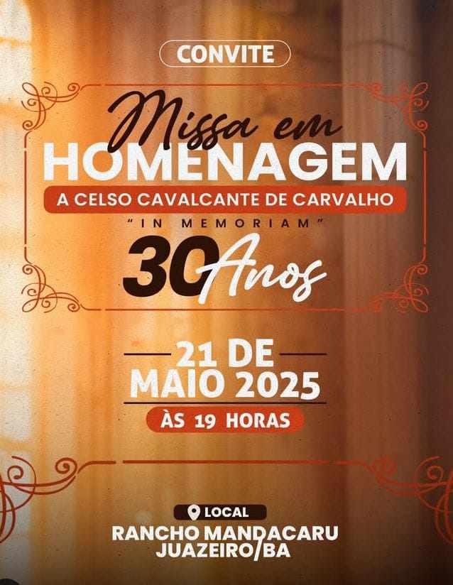 A celebração de uma missa vai marcar os 30 anos da morte de Celso Cavalcante de Carvalho, pai do ex-prefeito de Juazeiro (BA), Isaac Carvalho. O evento acontecerá nesta quarta-feira (21/05), às 19 horas, no Rancho Mandacaru.