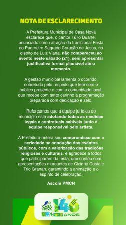 Casa Nova (BA): Prefeitura emite nota de esclarecimento sobre ausência de cantor em evento no distrito de Luiz Viana