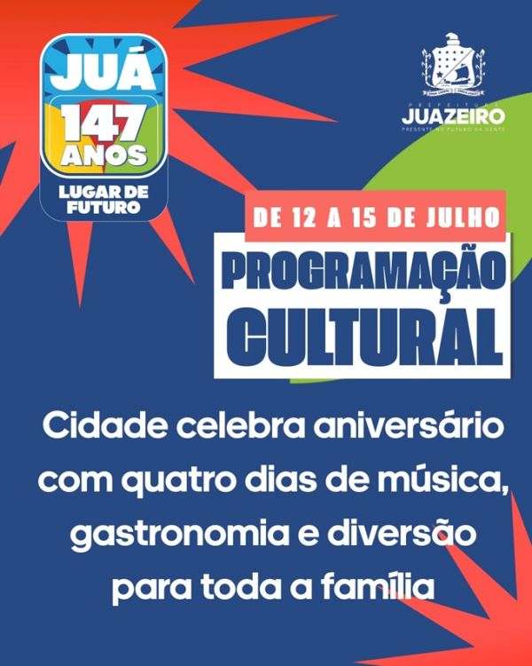 De 12 a 15 de julho, Juazeiro celebra seus 147 anos com uma programação especial na Orla II da cidade. Como parte das celebrações do aniversário, a Prefeitura de Juazeiro promove uma série de atividades culturais que valorizam a identidade local e movimentam a economia criativa do município.