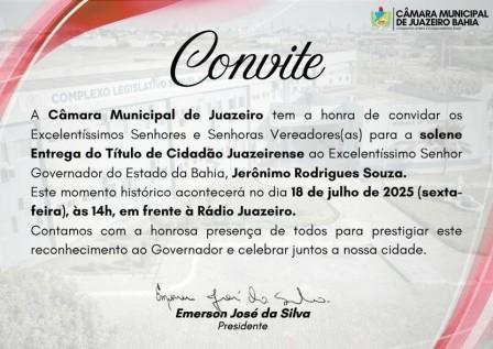 A Câmara Municipal de Juazeiro realiza, nesta sexta-feira (18/07), uma Sessão Solene para a entrega do Título de Cidadão Juazeirense ao excelentíssimo senhor Jerônimo Rodrigues de Souza, governador do Estado da Bahia. A solenidade acontecerá a partir das 14h, em frente à sede da Rádio Juazeiro, no centro da cidade.