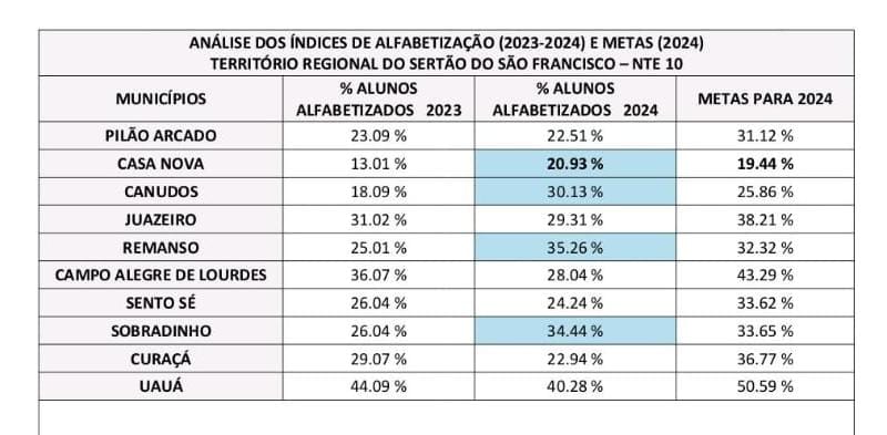 A meta de 33,65% prevista para este ano foi superada e o município atingiu um índice de 34,44% de crianças alfabetizadas. Entre as 10 cidades da região do Sertão do São Francisco, Sobradinho é destaque no avanço da meta do Criança Alfabetizada, alcançando o terceiro maior percentual no número de alfabetizações, e um dos maiores avanços em um comparativo dos índices de 2023 e 2024.