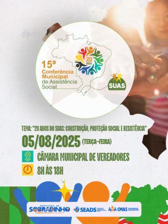 A Prefeitura de Sobradinho, através da Secretaria de Assistência e Desenvolvimento Social (SEADS) e do Conselho Municipal de Assistência Social (CMAS), convida toda a população, entidades, organizações de classe e a sociedade civil organizada para participar da 15ª Conferência Municipal de Assistência Social, que será realizada no dia 05 de agosto (terça-feira), das 8h às 18h, na Câmara Municipal de Vereadores.